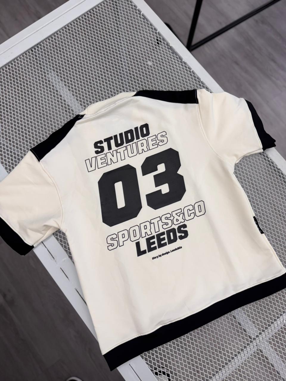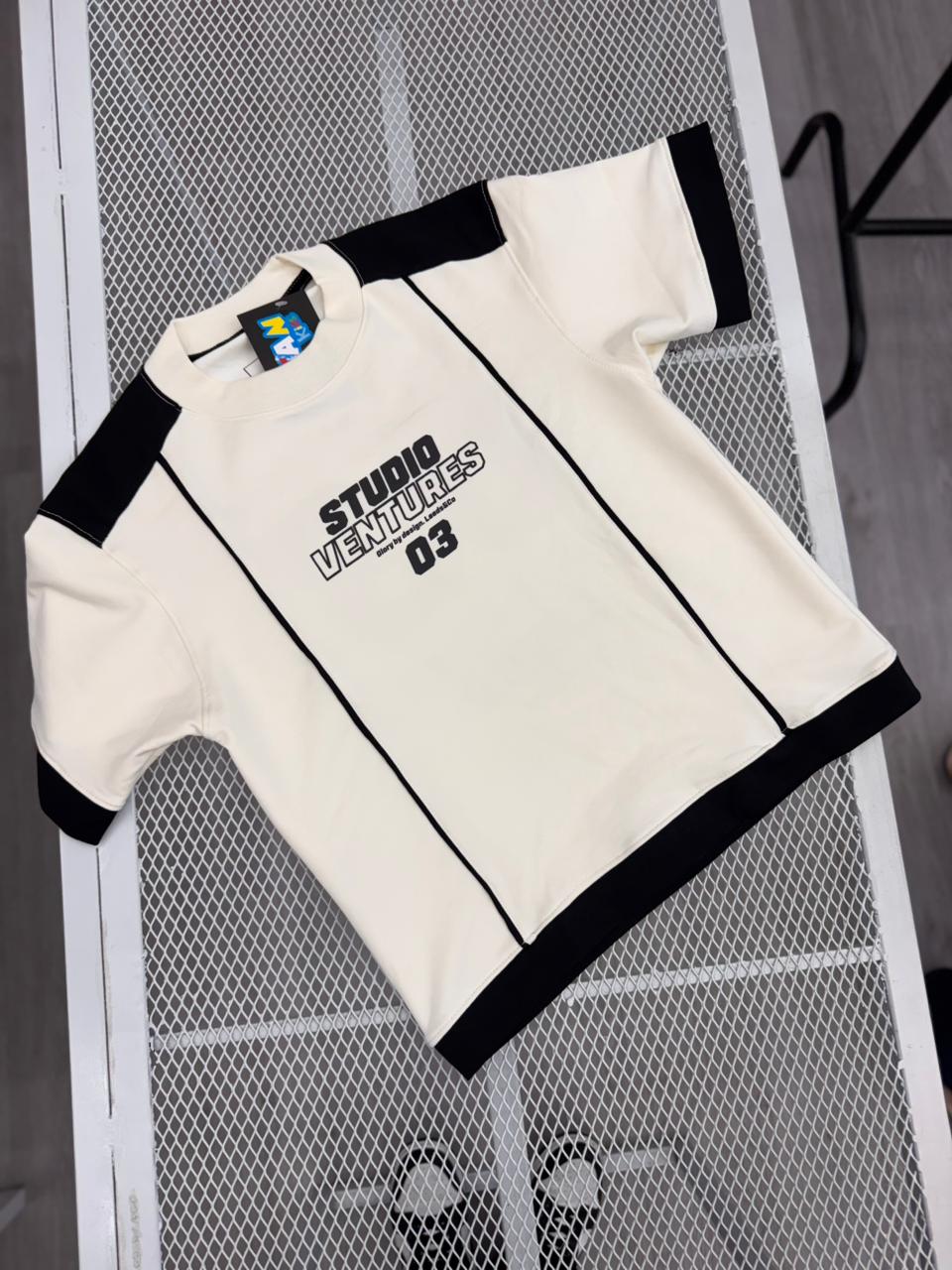 Diseño moderno con detalles en negro y beige, camiseta estampada y short bicolor de corte urbano.